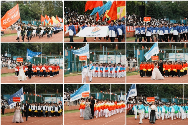 在方阵入场式中,各学院方阵队精神抖擞、步伐整齐,在主席台前进行创意表演,展现出朝气蓬勃的青春风采,赢得阵阵掌声。