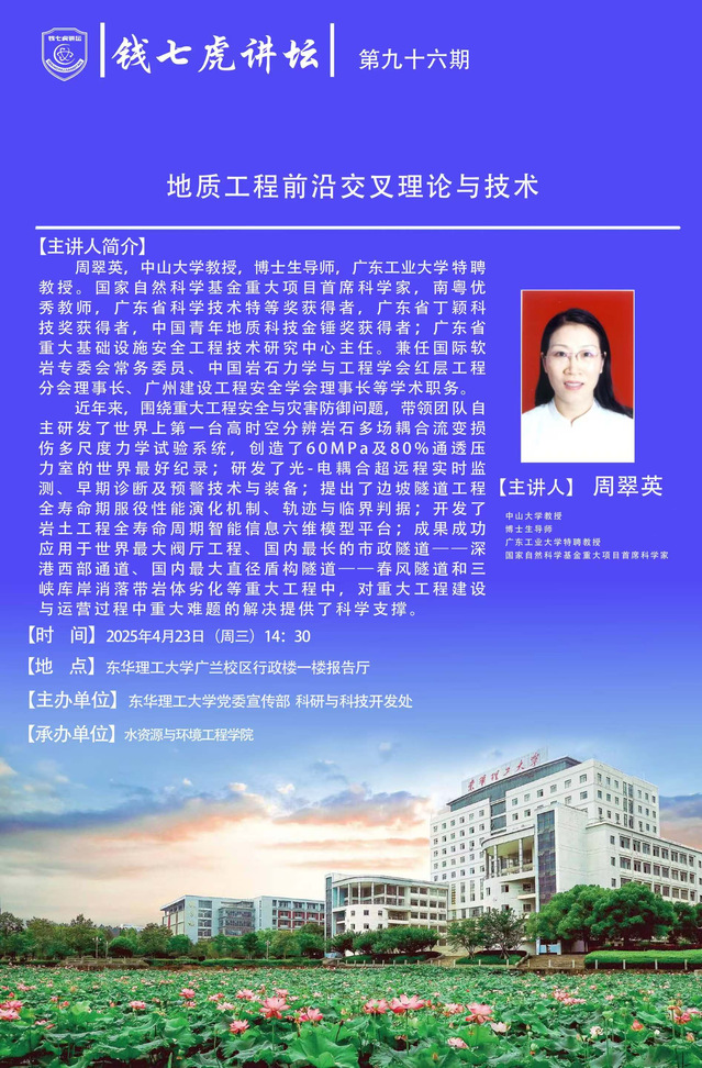 应乐鱼·体育水资源与环境工程学院邀请,中山大学教授,博士生导师,广东工业大学特聘教授周翠英到“乐鱼·体育”,以“地质工程前沿交叉理论与技术”为主题开展讲座。欢迎全校师生届时前往聆听。