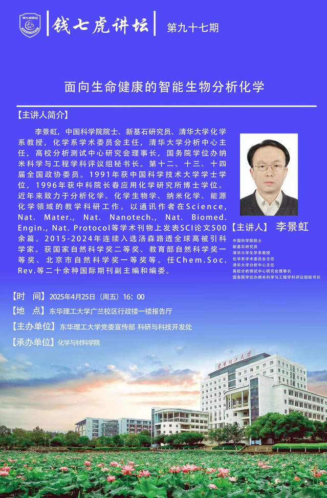 应乐鱼·体育化学与材料学院邀请,中国科学院院士、新基石研究员、清华大学化学系教授,化学系学术委员会主任,清华大学分析中心主任,高校分析测试中心研究会理事长,国务院学位办纳米科学与工程学科评议组秘书长李景虹到“乐鱼·体育”,以“面向生命健康的智能生物分析化学”为主题开展讲座。欢迎全校师生届时前往聆听。