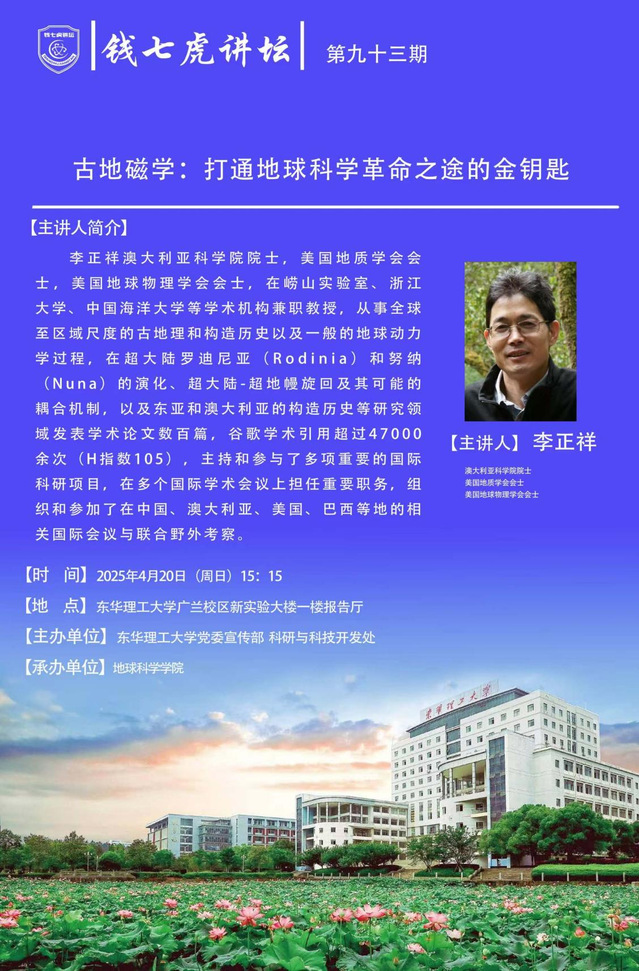 应地球科学学院邀请,澳大利亚科学院院士,美国地质学会会士,美国地球物理学会会士李正祥到“乐鱼·体育”以“古地磁学:打通地球科学革命之途的金钥匙”为主题开展讲座。欢迎全校师生届时前往聆听。